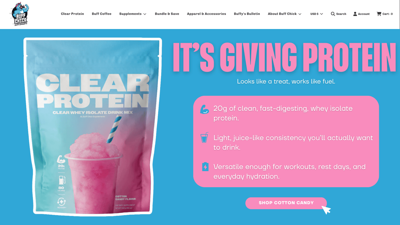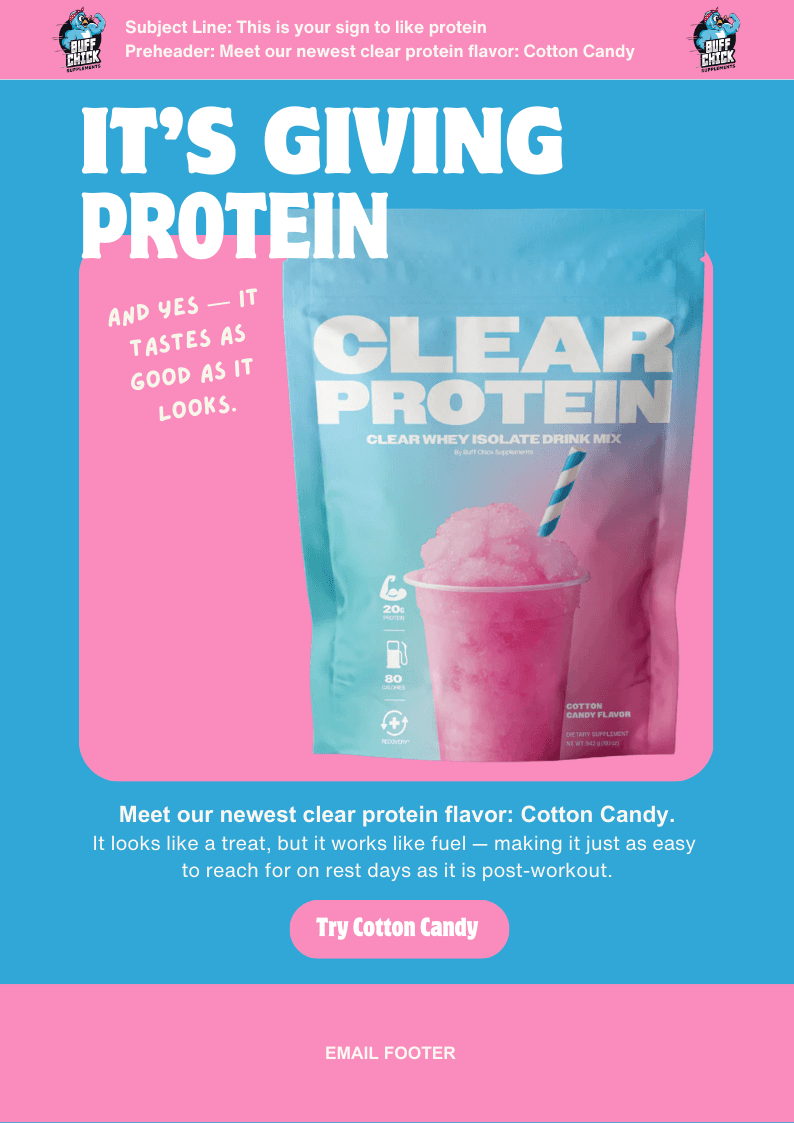 This mini campaign concept introduces a new Cotton Candy flavor of Buff Chick’s clear protein, designed to position the product as fun, approachable, and part of everyday wellness.