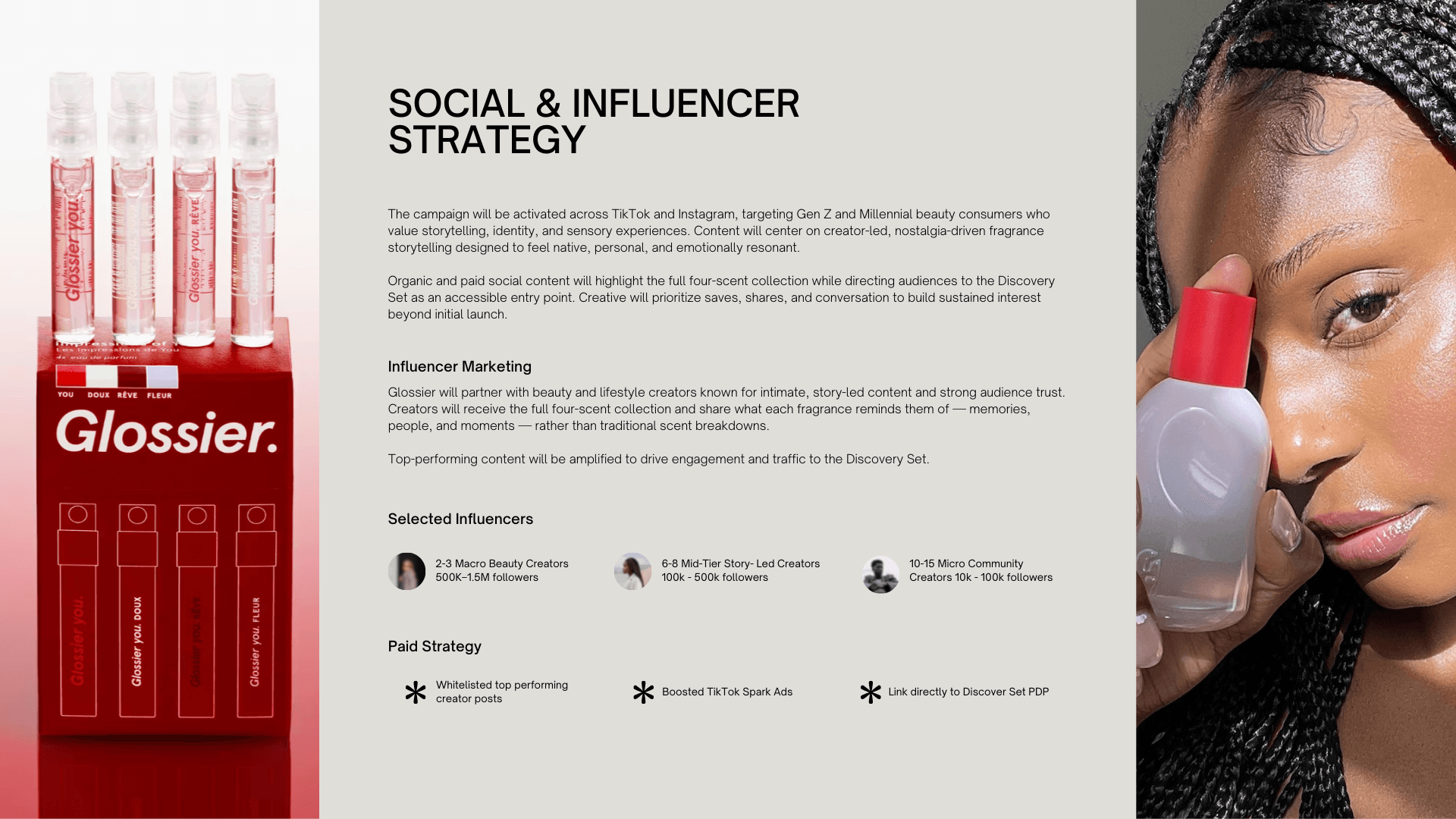 This campaign concept was designed to reintroduce Glossier’s four “You” fragrances through creator storytelling. Instead of focusing on traditional fragrance descriptions, the idea was to center the campaign around memories and personal moments connected to scent.